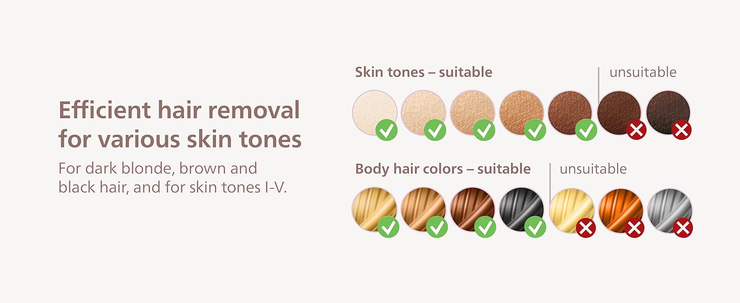 Check the skin tone and hair color tables in a user manual and read the safety instructions. Treatment is not effective if you have light blond, grey, red or white hairs. You can't use this hair remover if you have dark brown to dark skin tones.